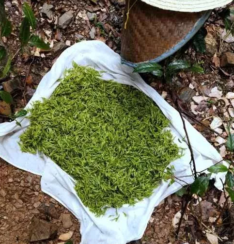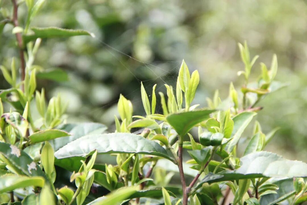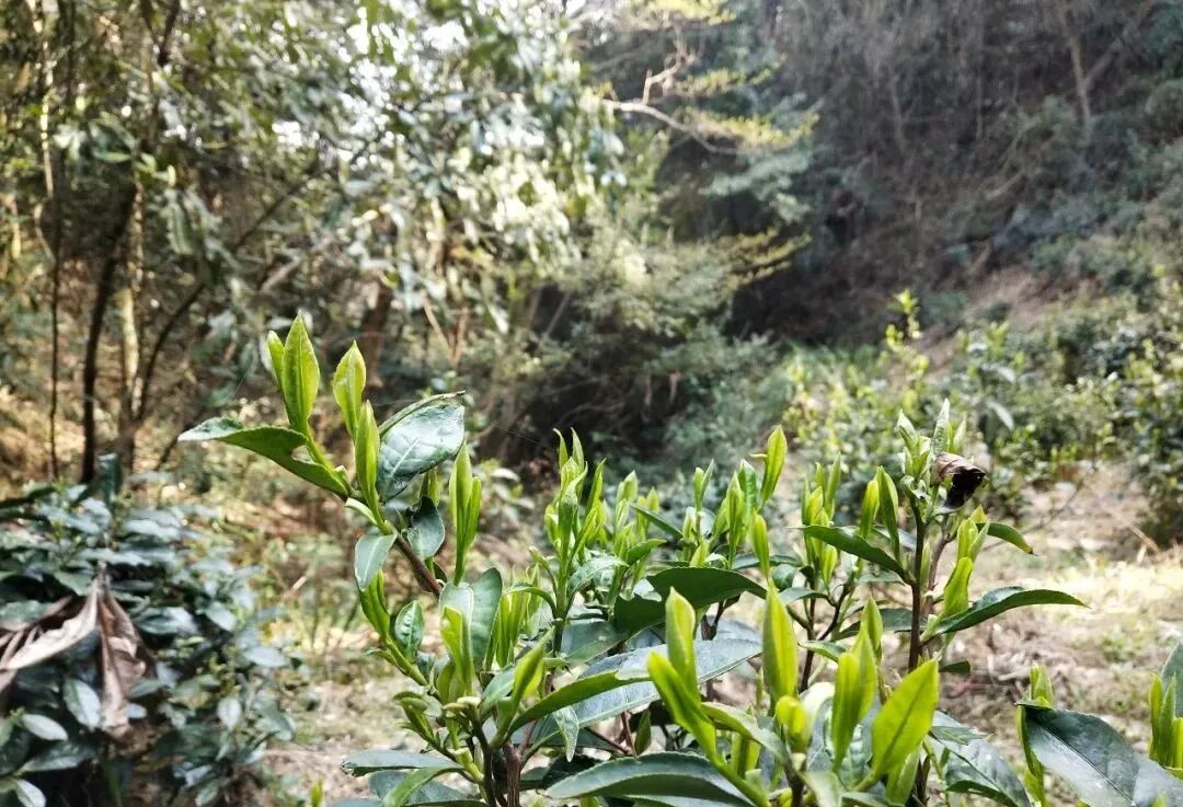 谷仓茶园,茶树品种是本地老楮叶种,相比较新培育栽种的一些新品种,茶叶出来比较晚,需要在每一棵茶树上,找几枝先冒出来的芽头,采下。所以每年的第一次茶叶也都极少。