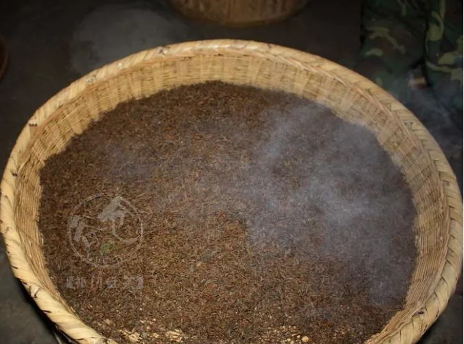 等发酵完的古铜色的柔软的叶子,在炭火竹笼的烘焙下,一点点地变成乌黑油润的干茶。
